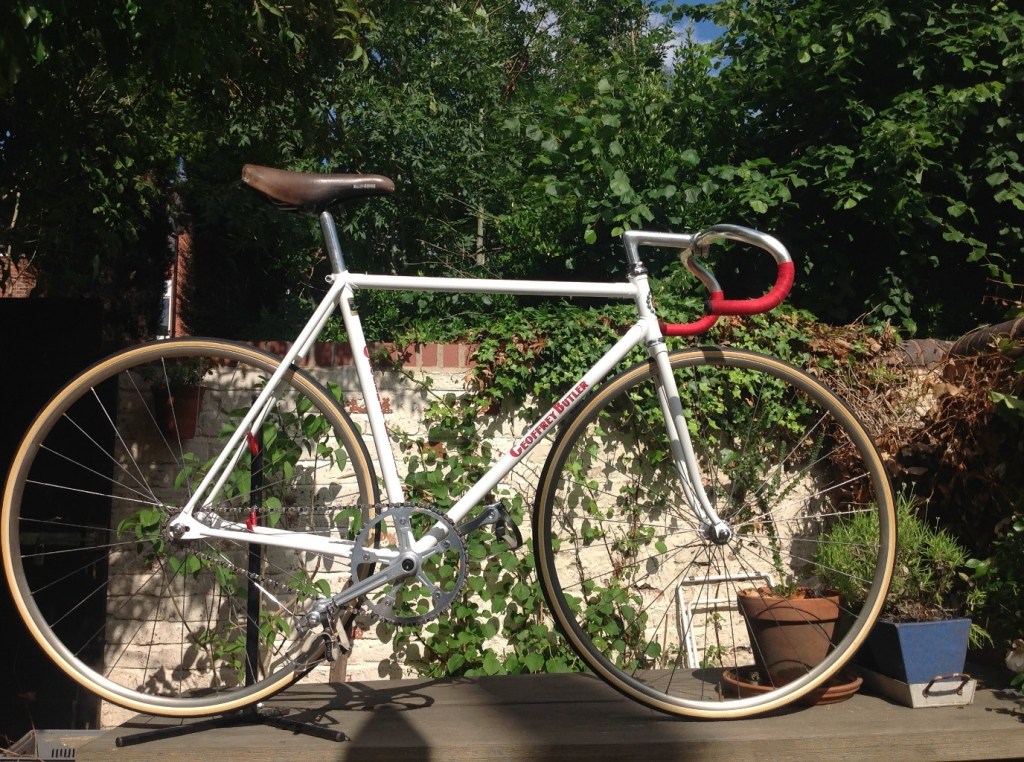 I bought the frame from an elderly fellow in South London who claimed it was an ex Maurice Burton 6 Day frame – although it looks the part there is nothing to substantiate his claim. The wheels were used by Darryl Webster to win a number of national championships for sure though – I bought them from him! Standard issue Campag….This one actually gets used! Well actually only on the odd open session at Manchester – I have only done the first stage of accreditation and am hopelessly unfit! Chainset and pedals concessions to modernity…Probably late sixties I think…. Came painted matt black with the wrong forks but distinctly Holdsworth! Forks obviously not original but are period correct. Old school Campag – any high pressure (that’s what we used to call clichers…) tyres as I though I might use it on the road. Painted by Mario Vaz (ex Holdsworth).