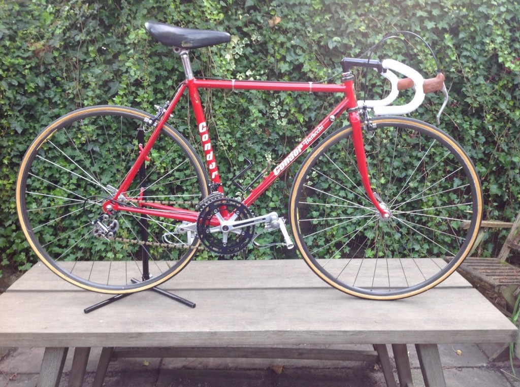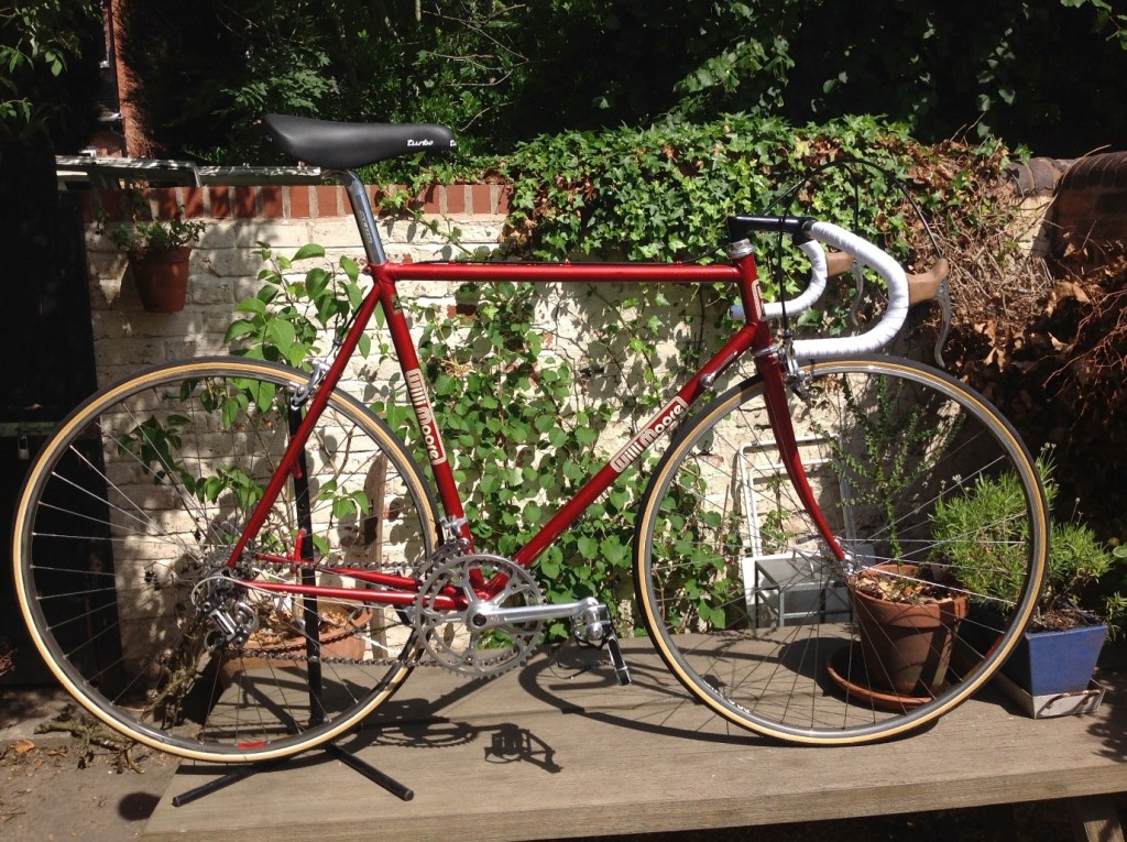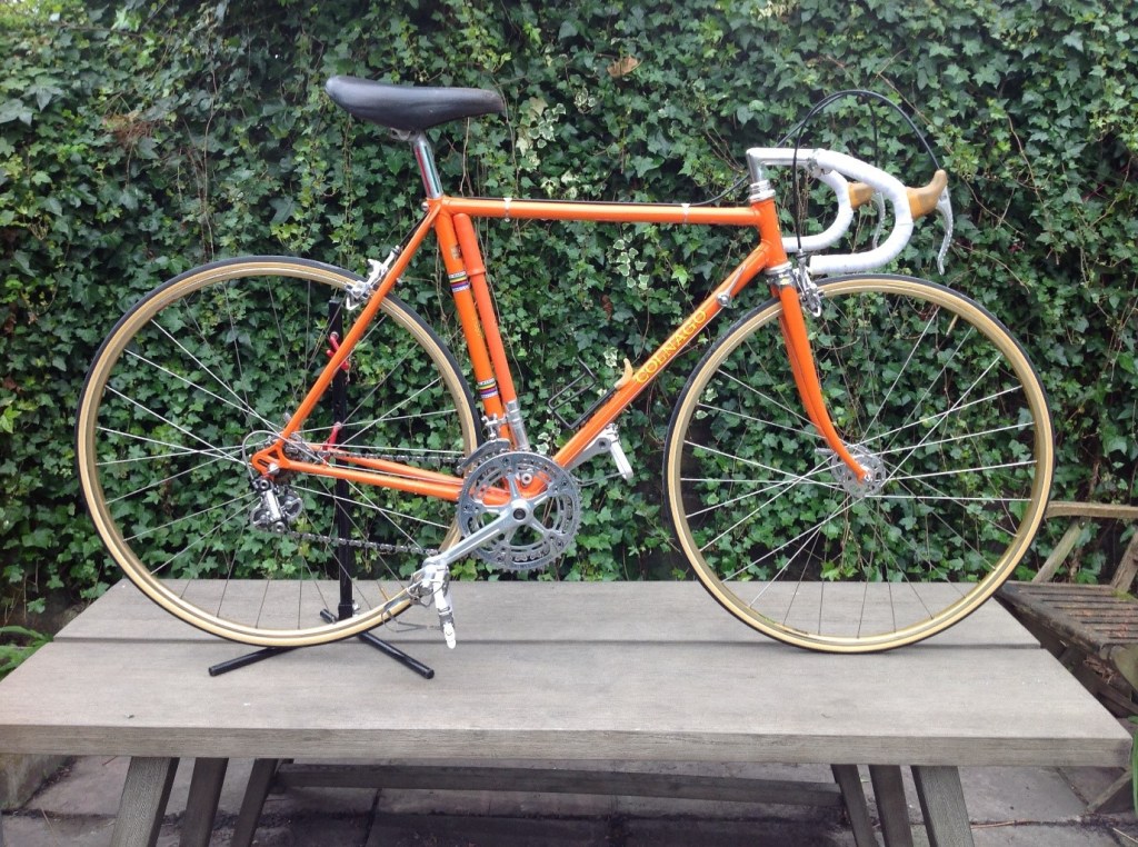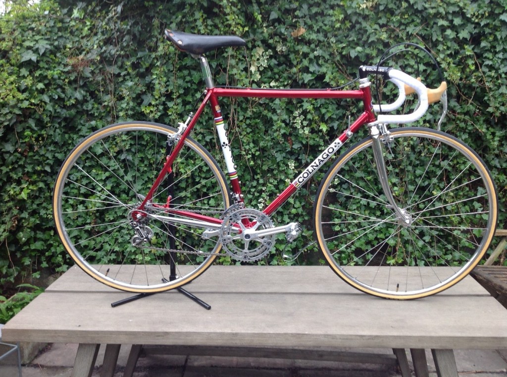 Charlie Roberts was one of the great British frame builders. Classic track frame equipped with Campagnolo apart from Ofmega cranks. Cinelli 1A track stem and 65 Criterium bars.Dave was a class rider who was unfortunate to join TI Raleigh under Peter Post’s reign (although be produced some fantastic results) and was forced to retire as a professional as the result of a heart condition but had a stellar career after… Nuovo Record, Galli brakes, 3TTT seat pillar (which I prefer to Campagnolo) and Sugino outer chainring. Very clever braze on for the front changer before Campagnolo did it….Doug went to see the Milk Race as a youngster (one of of the Oxford City Road Club members – Gordon Hinder – was radio control on the race) and was very impressed by the massive Polish riders as they emerged out of the mist on their Alan bikes climbing using their huge outside chainrings. Hence this (Nuovo Super Record mix) build.Vic Edwards built frame in original paint. This was Fred’s bike until he got too tall! First generation Dura Ace – appropriate given that Condor were amongst the first to embrace Shimano – even featuring their components in their frame brochures and equipping the bikes they supplied to the riders they supported with Dura Ace.A Felice Gimondi tribute… Second generation Super Record with pantographed outer chainring, stem and gear levers. Combination of long rear dropouts and second generation Super Record unusual – I used a photograph of Gimondi with one of his own bikes as guidance. Gimondi was one of the great stylists….Colnago Super unrestored – Nuovo Record set up for a pint size sprinter – check out how low the bars are! We have tried to do as little as possible to this bike – only original once and all that… That being said, the pantographed stem is probably actually a little too “late” for the bike….Another Vic Edwards built Condor – this time from the sixties with shallower angles and bigger clearances. Nuovo Record (old style cranks) throughout with handlebar end levers (that’s what we called bar end shifters) and Mafac centre pull brakes. Old Brooks saddle – have no idea what model!