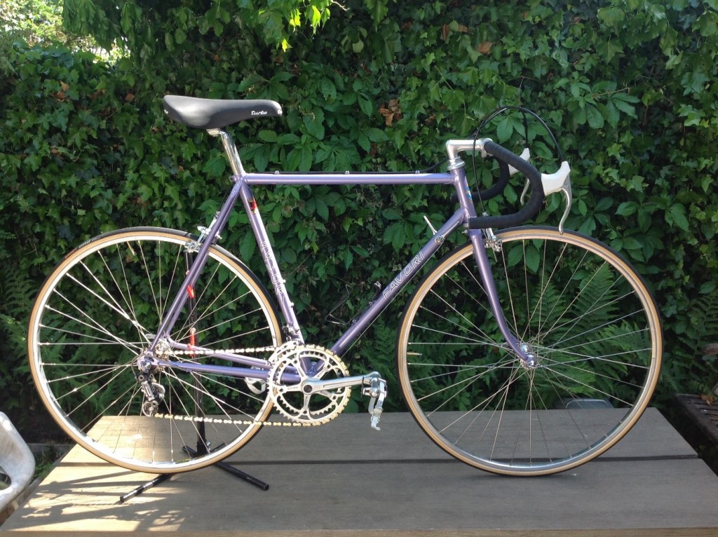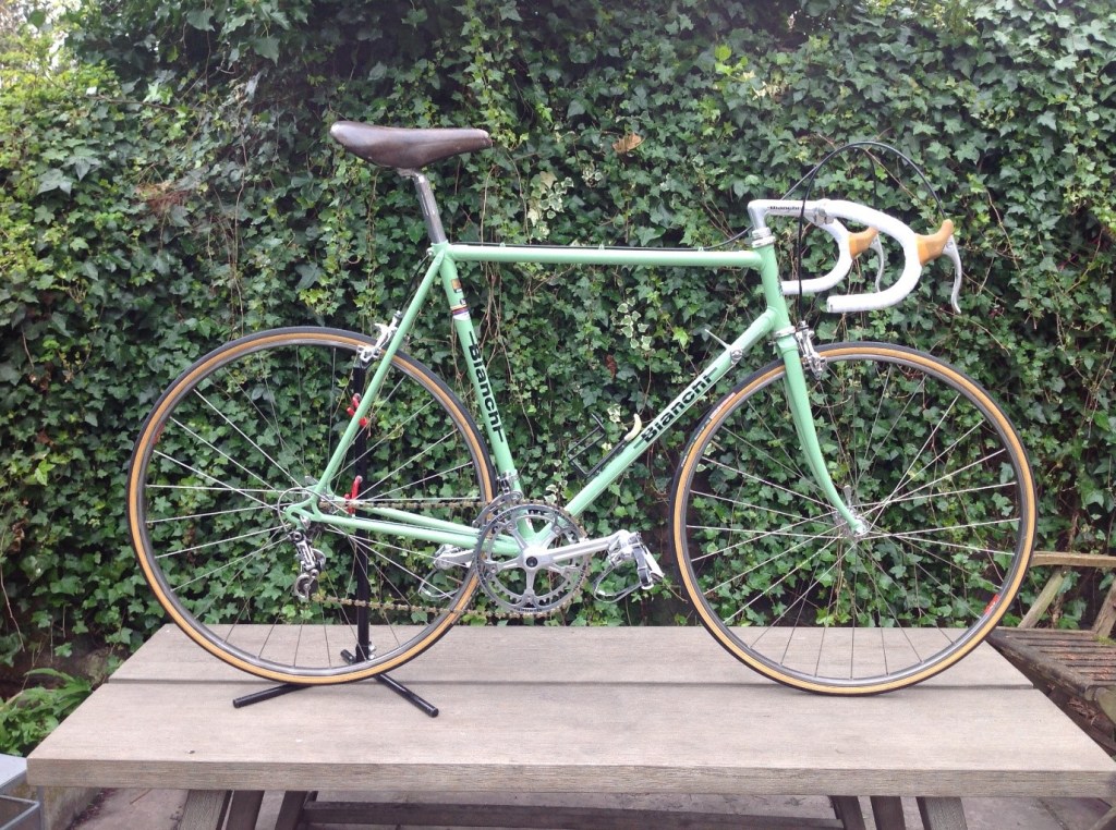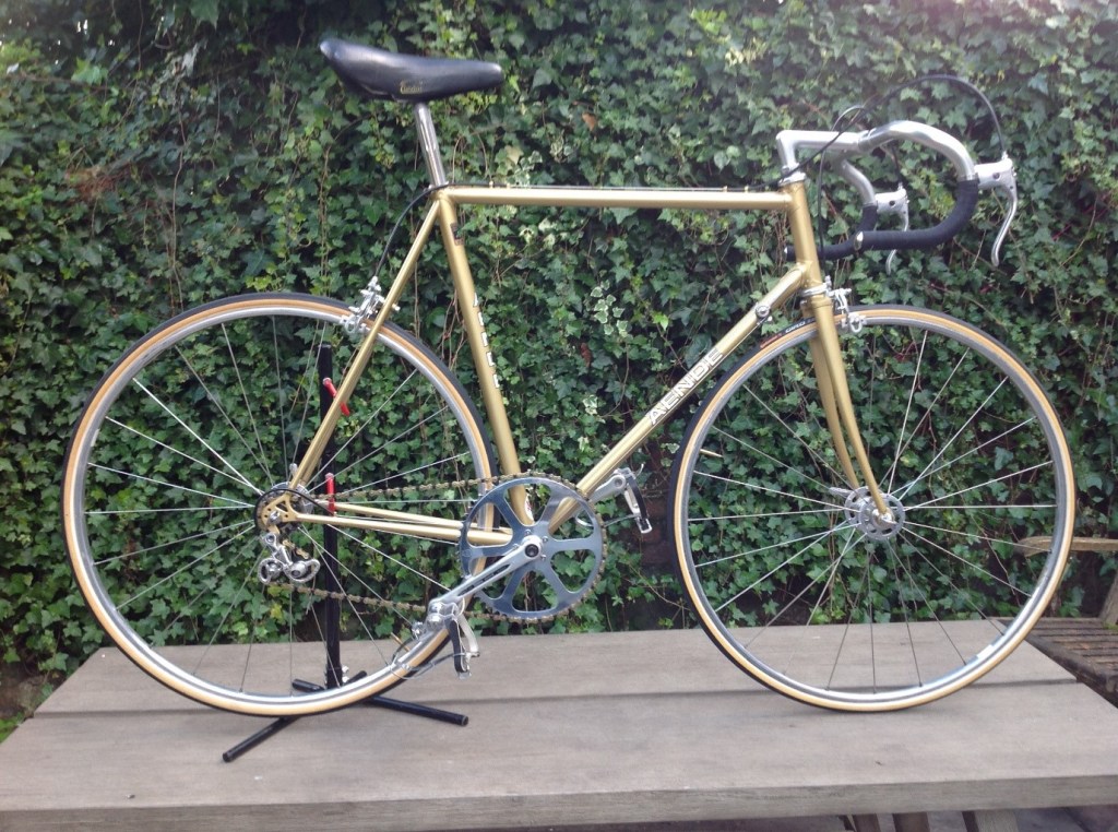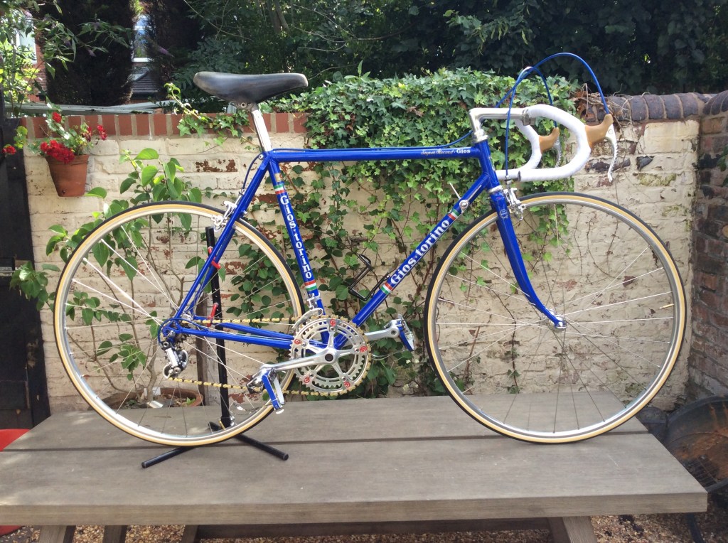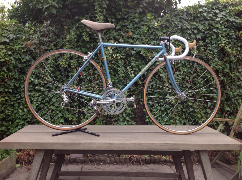 Charlie Roberts was one of the great British frame builders. Classic track frame equipped with Campagnolo apart from Ofmega cranks. Cinelli 1A track stem and 65 Criterium bars.Dave was a class rider who was unfortunate to join TI Raleigh under Peter Post’s reign (although be produced some fantastic results) and was forced to retire as a professional as the result of a heart condition but had a stellar career after… Nuovo Record, Galli brakes, 3TTT seat pillar (which I prefer to Campagnolo) and Sugino outer chainring. Very clever braze on for the front changer before Campagnolo did it….Doug went to see the Milk Race as a youngster (one of of the Oxford City Road Club members – Gordon Hinder – was radio control on the race) and was very impressed by the massive Polish riders as they emerged out of the mist on their Alan bikes climbing using their huge outside chainrings. Hence this (Nuovo Super Record mix) build.Vic Edwards built frame in original paint. This was Fred’s bike until he got too tall! First generation Dura Ace – appropriate given that Condor were amongst the first to embrace Shimano – even featuring their components in their frame brochures and equipping the bikes they supplied to the riders they supported with Dura Ace.A Felice Gimondi tribute… Second generation Super Record with pantographed outer chainring, stem and gear levers. Combination of long rear dropouts and second generation Super Record unusual – I used a photograph of Gimondi with one of his own bikes as guidance. Gimondi was one of the great stylists….Colnago Super unrestored – Nuovo Record set up for a pint size sprinter – check out how low the bars are! We have tried to do as little as possible to this bike – only original once and all that… That being said, the pantographed stem is probably actually a little too “late” for the bike….Another Vic Edwards built Condor – this time from the sixties with shallower angles and bigger clearances. Nuovo Record (old style cranks) throughout with handlebar end levers (that’s what we called bar end shifters) and Mafac centre pull brakes. Old Brooks saddle – have no idea what model!