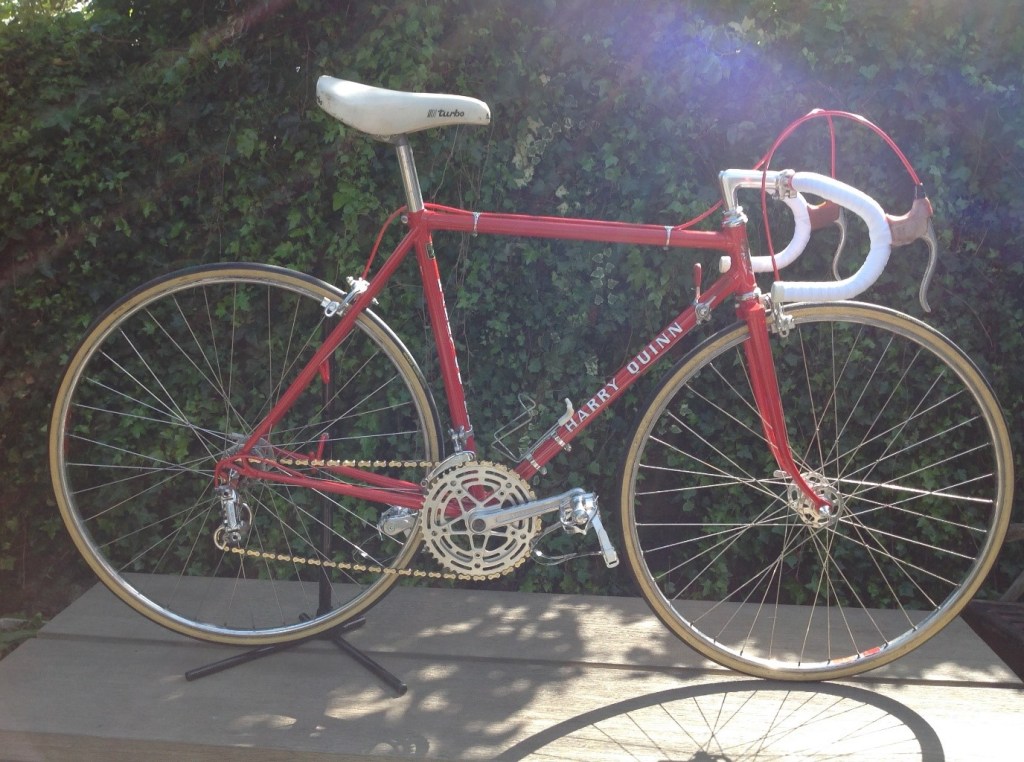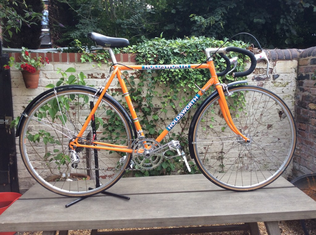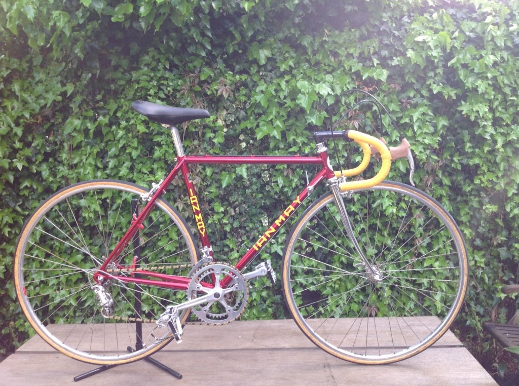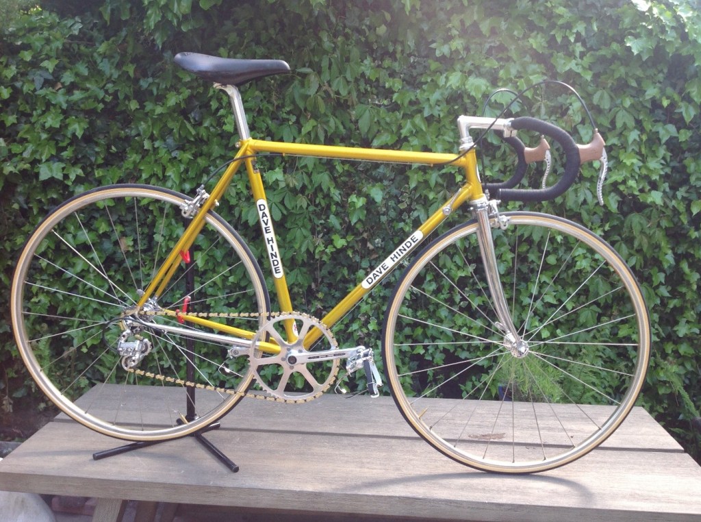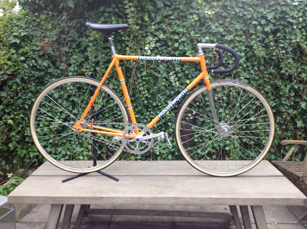 Colnago Nuovo Mexico in Saronni red (Saronni won the world road race championships in 1982 at Goodwood). Second generation Campagnolo Super Record with Colnago pantographed outer chainring, stem and seat pillar. One of his main rivals was Francesco Moser – more about him a few bikes down…Mercian winter or training bike with clubman’s kit of Nuovo Record, Stronglight 49D cranks with TA chainrings and Weinmann 500 brakes. High pressure (that’s what we used to call clinchers) tyres. The eagle eyed will have spotted the lack of gear levers – it does have some now!A time trial frame from Pongo Braithwaite, known for the severe geometry of his frames and disposition to drill a lot of holes – both characteristics of this frame. A “very little Campagnolo” build – TA cranks (with a 58 chainring – Campagnolo only went to 57) Weinmann brakes and Huret Jubilee rear mech (a tester’s favourite).Dave was (and is!) probably best known for his track bikes but he built road and time trial frames too. Another alternative to Campagnolo build – TA and Weinmann again – but a Sun Tour Superbe rear mech which actually worked rather better than the Huret Jubilee (if you were worried about changing gear of course!).Another Colnago Super – this one restored in proper Eddy Merckx “pumpkin” – I am reliably informed by Chris Sidwells that is what he calls the colour! First generation Campagnolo Super Record, Mavic Oro rims and lots of pantograhing. Last ridded in by Florence the excellent Tom Simpson Memorial Ride.Dave was based in Slough and a lot of local riders rode his frames. This is more of his more moderate builds – some of his frames were very short! Stronglight 49D cranks with TA chainrings, Dura Ace mechs, 3TTT seat pillar and Weinmann 500 brakes. And a mad colour scheme!Geoffrey Butler specialised in very tight Six Day geometry and clearances – check out the gap between the front wheel and the down tube. You can’t even fit in 25mm tubulars! Campagnolo equipped with the Record Pista small flange wheels that Darryl Webster rode to multiple national championships. Built to seventies club racer specification – not all Campagnolo…. Stronglight cranks and Universal 68 brakes which were very frequently used – very similar to the bike ridden by a young Phil Bayton. Harry Quinns were also often ridden by many of the great riders – Doug Dailey, Dave Lloyd – from the Kirkby Cycling Club. And Harry Quinns were generally red!Holdsworth Mistral from the early seventies – note the ample fork rake. Commonly used components – TA cranks and chainrings, Mafac brakes with Weinmann levers, “high pressure” tyres rather than tubulars, otherwise Nuovo Record and mudguards for winter training. Classic team coloursKen Bird was well known for his time trial bikes which often had very short wheelbases, close clearances, brazed on brake pivot bolts and lots of holes! This little road bike has all of these… Nuovo Record with Super Record chainrings, Weinmann brakes, 3TTT seat pillar, bars and stem. Unusually for a Ken Bird not white!Frame built by Barry Chick, who also built Shorter frames for Alf Engers and others. Beautifully lightened with cutaway lugs and trademark time trial geometry and clearances. First generation Campagnolo Super Record, Weinmann 500 brakes, 3TTT bars and stem and 28 spoke wheels.Willi Moore was an exceptional rider – bronze in the team pursuit at the 1972 Olympics – this is the only Willi Moore frame we have seen though. It is very similar to a Harry Quinn – Moore did ride Harry Quinns- but it seems Mike Mullett did work with him. Second generation Campagnolo Super Record with Galli brakes.We are big fans of Roger de Vlaeminck (five times Paris Roubaix winner and perhaps the greatest classic rider ever) and this is something of a tribute to him and Patrick Sercu. First generation Super Record with pantographed outer chainring and gear levers.As ridden by Francesco Moser (and Phil Edwards about whom Wiggins wrote a chapter in “Icons” – well worth a read). In original paint with a mix of second generation Super Record and Nuovo Record and proper original Benotto bar tape. some essential watching – A Sunday in Hell – where you see Roger de Vlaeminck also!Doug’s own track bike – ridden at Manchester Velodrome (quite slowly). 1978 frame with Campagnolo but modern cranks – nice CNC Campagnolo copy. The short stem is in deference to Doug’s increased girth. Apologies for the modern pedals….