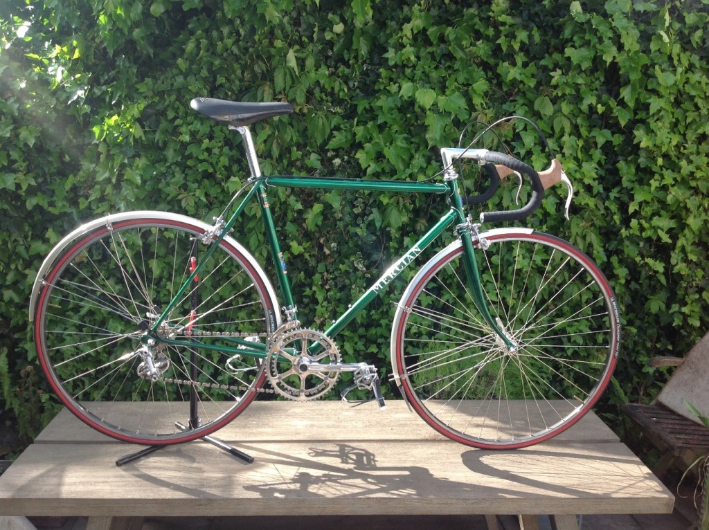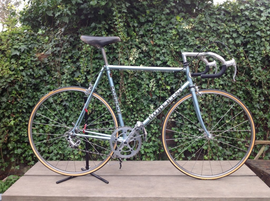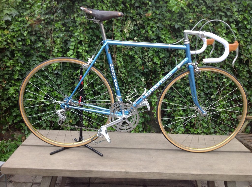 Harry Hall’s was (still there at a different address) a great Manchester bike shop. His service vehicle was seen at most of the major races and he would reward you if you were pictured riding one of his frames in Cycling (Weekly) or the “comic” as it was then known – which could easily be spotted by the “HH” on the head tube. First generation Dura Ace throughout, Brooks professional, Cinelli bars and stem.Doug’s bike built in the winter of 1975 in preparation for his first season as a Junior. Ordered from Roy Thame (Holdsworth Campagnolo team manager) himself it’s a Cronometro (a time trial frame) but built for the road. Nuovo Record throughout, 3TTT stem, Cinelli bars and saddle and probably the only titanium Everest freewheel in Britain at the time! Would have a 48 tooth chainring then to meet the 86″ gear restriction.From (we imagine) the late sixties. When we got this frame it was painted matt black, had no transfers and incorrect forks, however it is unmistakably Holdsworth. The forks are not Holdsworth but are correct. Campagnolo throughout although the seat pillar is not period – it will be changed!Ian May was based in the Wirral and sold just a few frames, but they were all very tidy. This one is tiny! Nuovo Record but with Galli brakes which were a popular alternative (especially amongst time trialists) to Campagnolo as they were very light – and much cheaper!Roberts were well known for their time trial frames – this one is in its original paint. Campagnolo Nuovo Record but with the aftermarket alloy bolts that were often used (although were expensive…) as an alternative to buying Super Record. Usual period gearing – 57 tooth chainring and 13 to 17 freewheel.Another Barry Chick built Shorter frame. Classic time trial set up – 57 by 17 bottom gear! Campagnolo Nuovo Record with some (but not crazy drillium) lightening. First generation 3TTT Record stem, Weinmann 500 brakes and very few spokes in the wheels!Julie’s bike for Eroica. Barry Hoban (and Raymond Poulidor) tribute Mercier with pre 1978 Nuovo Record and some specifically French components – the French have their own sizes and threads! Have a look at our Family Album page for pictures of Julie and the cardigan she knitted to match….